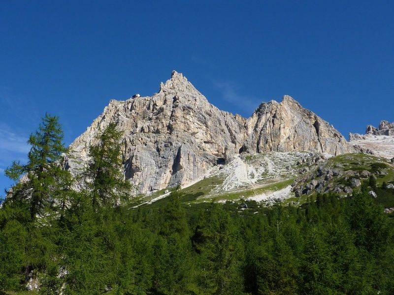 Vor dem eigentlichen Einstieg in den Klettersteig orientierten wir uns erst einmal ausgiebig. Die Gegend um den Col dei Bos war ein im Ersten Weltkrieg hart umkämpftes Gebiet. Auch wenn andere Gipfel (Monte Piano, Paternkofel, Lagazuoi) dafür noch bekannter sein mögen, die Kriegsrelikte holten uns auf dieser Tour immer wieder ein. So lässt der Einstieg zu dem Klettersteig nicht nur einen sensationellen ersten Blick Richtung Marmolada zu, er liegt auch nur einen Steinwurf entfernt von einem ehemaligen italienischen Kriegslazarett. Die Ruinen selbst sind noch sehr gut zu erkennen, ihr Verwendungszweck glücklicherweise nicht mehr. Dennoch ist es immer wieder etwas bizarr, in einer Gegend Urlaub zu verbringen und Spaß zu haben, in der so viele Menschen im Ersten Weltkrieg ihr Leben verloren haben.
